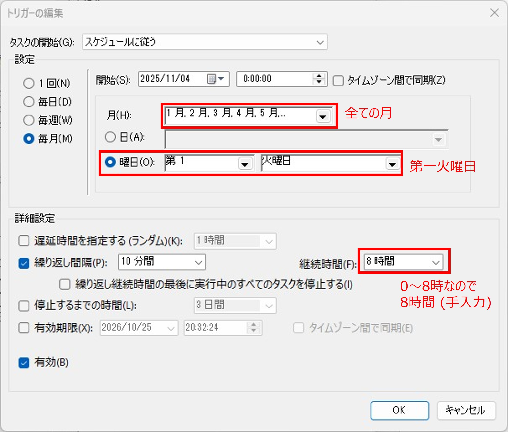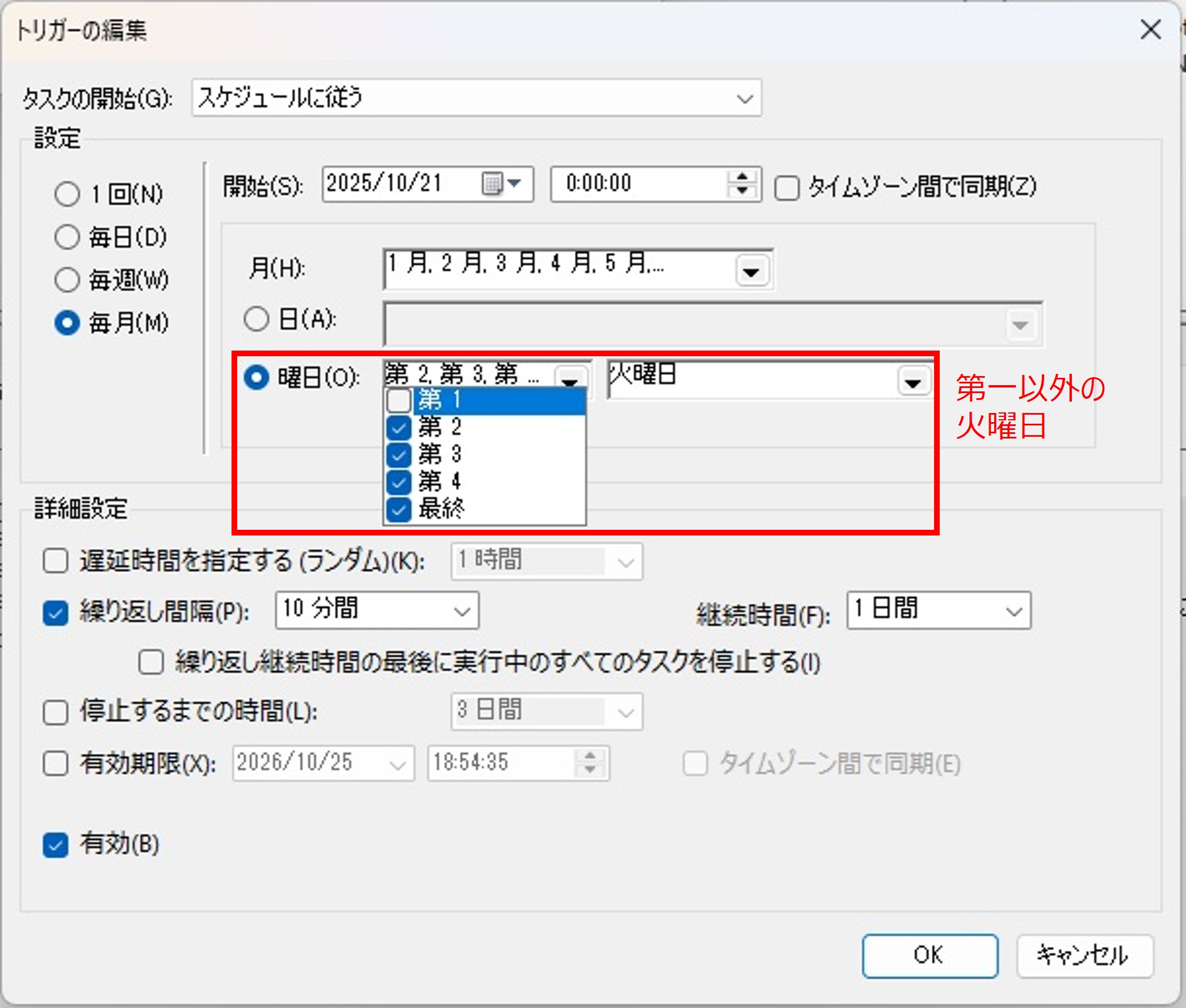 私のタスクスケジューラ設定 2025.10.252025.10.26 「JRA-VANのメンテナンス時間(第一火曜日8:00~15:00)は更新を避ける」設定の方法を紹介します.(メンテナンスの時間帯が変わったときは適宜修正) トリガー条件として以下の4つを設定します. まず第一火曜日ののメンテ期間前の0:00~8:00の設定です. 次に,第一火曜日のメンテ期間後の15:00~24:00の設定です. そして,第一以外の火曜日の設定です. 最後に,火曜日以外の設定です. 設定できた内容は以下になります.